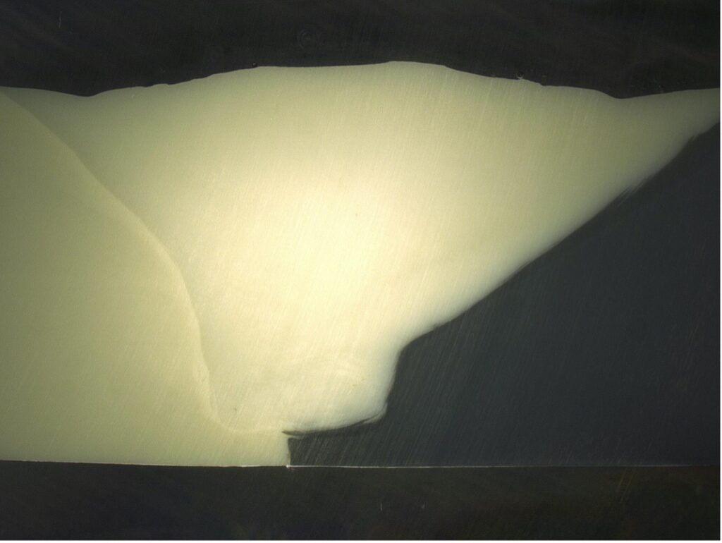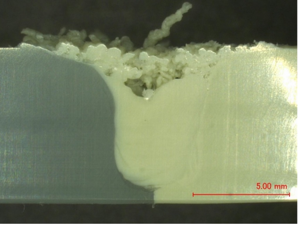 Im Bild 4 ist ein Querschnitt dieses Schweissversuchs abgebildet. Es ist zu erkennen, dass das Material im untersten Bereich der Schweisszone nicht verrührt wurde, dies ist auf die Länge des Pins zurückzuführen, welcher nicht bis zum Grund der zu verschweissenden Platten reicht. In der Mitte ist ein sehr homogener Bereich erkennbar, in welchem das Material der zwei Substrate verrührt wurde. Auf der Oberseite ist die Qualität der Schweissstelle noch zu verbessern. Es wurden einige Späne aus der Schweissstelle befördert, dies führt zu einem Materialdefizit in der Schweisszone, was erklärt, wieso die Schweisszone nicht komplett gefüllt werden konnte. Ziel der weiteren Versuche ist es, diese Probleme zu lösen und so die Festigkeit der Verbindung weiter zu verbessern.
