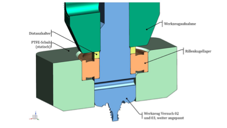 Aufgrund der sehr guten Ergebnisse bezüglich der Festigkeit, wird entschieden, das Werkzeugkonzept mit der statischen Schulter weiter zu optimieren. Mit dem optimierten Werkzeugkonzept, welches in Bild 8 dargestellt ist, können nicht nur Stumpfnähte, sondern auch Kehlnähte erstellt werden. Zusätzlich werden auch Versuche mit glasfasergefüllten Substraten aus PA66 durchgeführt.