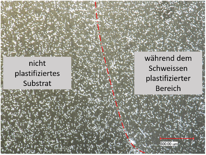 Mithilfe von Schliffbildern, kann gezeigt werden, dass das Reibrührschweissen von Kunststoffen vor allem bei Kunststoffbauteilen, welche mit Glasfasern verstärkt sind, sehr gut funktioniert und ein grosses Potenzial hat. Auf dem Schliffbild in Abbildung 9 ist der Bereich, in welchem der Kunststoff plastifiziert wurde, gut zu erkennen. Bei einer näheren Betrachtung kann man jedoch feststellen, dass es eine durchgängige Glasfaserverstärkung auch über die Fügestelle hinweg gibt. Dies ist einzigartig beim Schweissen von Kunststoffen.