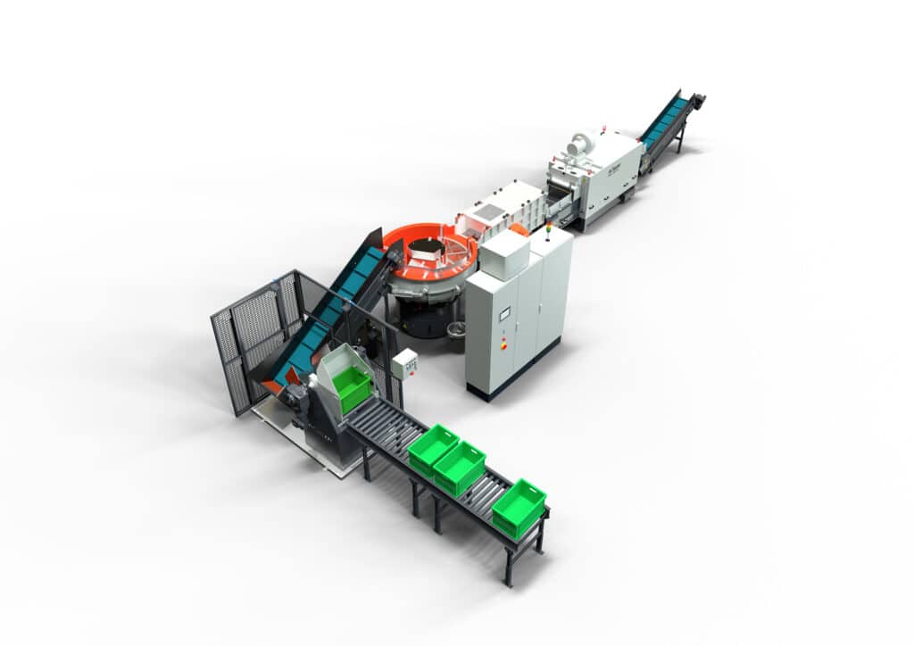 Die Anlagenverkettung von Rösler besteht aus sechs Einheiten: Über eine Rollenbahn werden die Werkstückkisten mittels Kippgerät zur Beschickung transportiert und über diese aufs Zuführband gegeben. Dort wird vom Anlagenbediener, je nach Grösse und Geometrie des Bauteils, das entsprechende Bearbeitungsprogramm gewählt. Anschliessend werden die Steckverbinder-Gehäuse vom Zuführband automatisch in einen Rundvibrator dosiert und dort in einem Prozessschritt entgratet sowie entfettet. Nach Ende der definierten Bearbeitungszeit beginnt die Maschine mit der automatischen Entleerung des Rundvibrators und über ein Maschensieb erfolgt die Separierung der Teile vom Schleifmedium. Anschliessend werden diese auf einer Vibrationswaschanlage mit Wasser-Compoundgemisch abgesprüht und mit getrennter Prozesswasserführung nachgereinigt, bevor sie in einer automatischen Durchlauftrocknung getrocknet werden. Danach gelangen die Teile über ein Transportband in die kundenseitigen Transportbehältnisse. Bis auf wenige Ausnahmen, wie die Wahl des Bearbeitungsprogramms, läuft der Prozess komplett ohne die Unterstützung des Bedienpersonals ab.