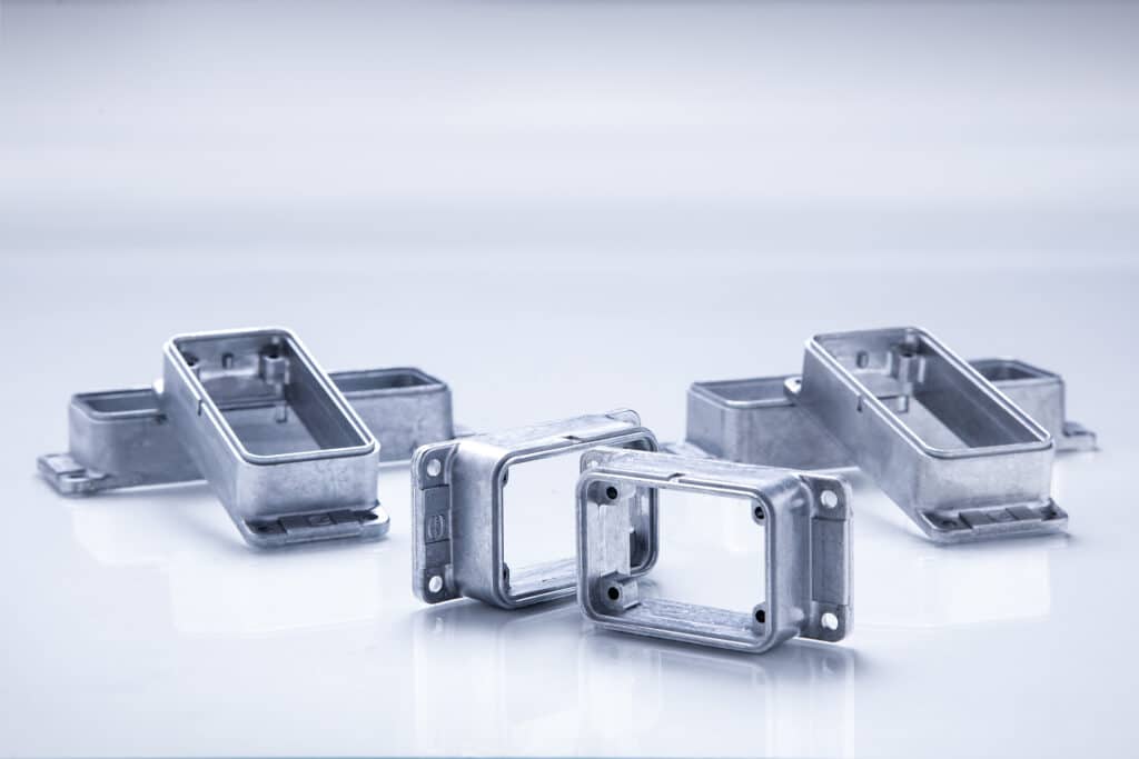 Harting hat sich an diesem Standort auf die Herstellung von Aluminiumsteckverbindern spezialisiert. Die Gehäuse werden zunächst im Druckgussverfahren produziert und anschliessend mechanisch bearbeitet, wobei Gewinde gefräst und Löcher gebohrt werden. Die dabei eingesetzten Kühl- und Schmierstoffe machen eine anschliessende Teilereinigung erforderlich, die in der Rösler-Verkettung parallel zur Bearbeitung der Oberflächen sowie der Entschärfung der Kanten ausgeführt wird. Dieser Prozessschritt bereitet die Werkstücke für ein anschliessendes Pulverbeschichtungsverfahren vor, das dem Korrosions- und Oberflächenschutz dient. Die Grösse der bearbeiteten Steckverbinder-Gehäuse variiert von 60 x 40 x 30 Millimeter bis zu 220 x 140 x 60 Millimeter und pro Charge können je nach Werkstückgrösse bis zu 1500 Teile bearbeitet werden.