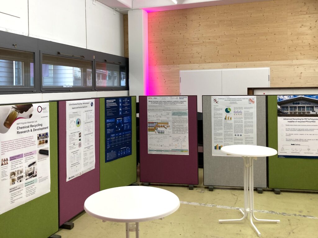 Die begleitende Postersession präsentierte eine Reihe von Projekten wie PET-Recycling-Innovationen, molekulare Technologien für das Recycling, neue Behandlungssysteme für gemischte Siedlungsabfälle und Ansätze zur Kommerzialisierung chemisch recycelter Polyolefine. Das Institut für Mikrotechnik und Photonik der OST stellte verschiedene Ansätze für chemisches Recycling im Kontext des Kunststoff-Lebenszyklus vor, während die FHNW ein Fahrrad aus recycelten Carbonfasern präsentierte und Industrieaussteller ihre Produktportfolios zeigten.