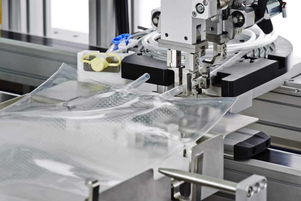 Um zu zeigen, wie leistungsfähig die modularen Anlagen von Knoll Feinmechanik sind, wird hier ein Arbeitsschritt des vollständig automatisierten Gesamtprozesses beschrieben: das Zusammenfügen von Schlauch und Beutel.