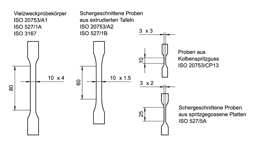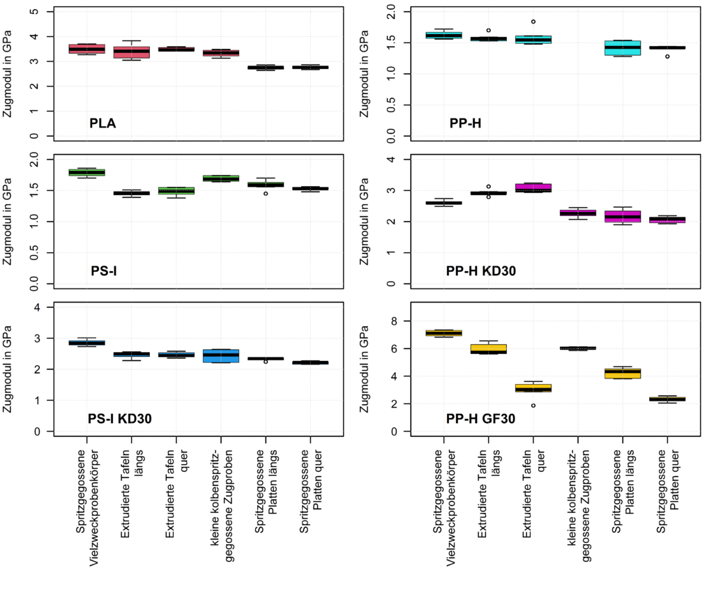 Aus den insgesamt acht Materialien wurden verschiedene Zugprobekörper mittels Spritzgiessens eines Vielzweckprobekörpers, Spritzgiessens von Platten und Extrusion von Tafeln mit anschliessender mechanischer Bearbeitung und der Herstellung eines kleinen Zugprobekörpers auf einer Labor-Kolbenspritzgiessmaschine hergestellt. Alle Methoden werden nach aktuellem Stand der Technik angewendet, werden in internationalen Normen beschrieben und zeigen unterschiedliche Beeinflussung des Materials in puncto Scherbelastung, Abkühlgeschwindigkeit und Molekülorientierung.