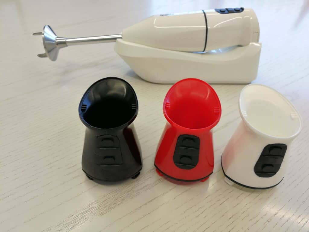 «Wir arbeiten bereits seit rund 50 Jahren mit diesem Unternehmen zusammen», so Erni. Von da kommt auch das jüngste Projekt: Sturo kann für Esge unter anderem den Griff mit Bedientaste für den neuen kabellosen Stabmixer Bamix herstellen. Im Griff ist der Akku integriert. Der bisherige Mixer hatte ein Kabel. Das 2K-Teil, das im Griff integriert ist, hat zwei Funktionen: zum einen die Bedienbarkeit über die Weichkomponententasten, zum anderen den Motor vor Wasser zu schützen mittels einer Dichtlippe. Zur Anwendung kommen ein TPE und ein PA6.