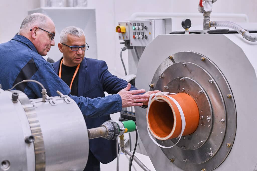 Ein Highlight war die Weltpremiere des neuen PVC-Mehrschichtrohrkopfs, der in der Live-Demo die Produktion dreischichtiger Rohre aus Neuware und geschäumtem Kern vorführte. Das neuartige Verteilsystem verhindert Spiderlines und damit potenzielle Sollbruchstellen. Dank seiner Materialflexibilität, inklusive der Verarbeitung von Rezyklat, leistet der neue Rohrkopf einen Beitrag zu mehr Nachhaltigkeit. Darüber hinaus konnten die Besucher in Live-Demos die Herstellung von PE-PA-Rohren sowie die PVC-Granulierung erleben.