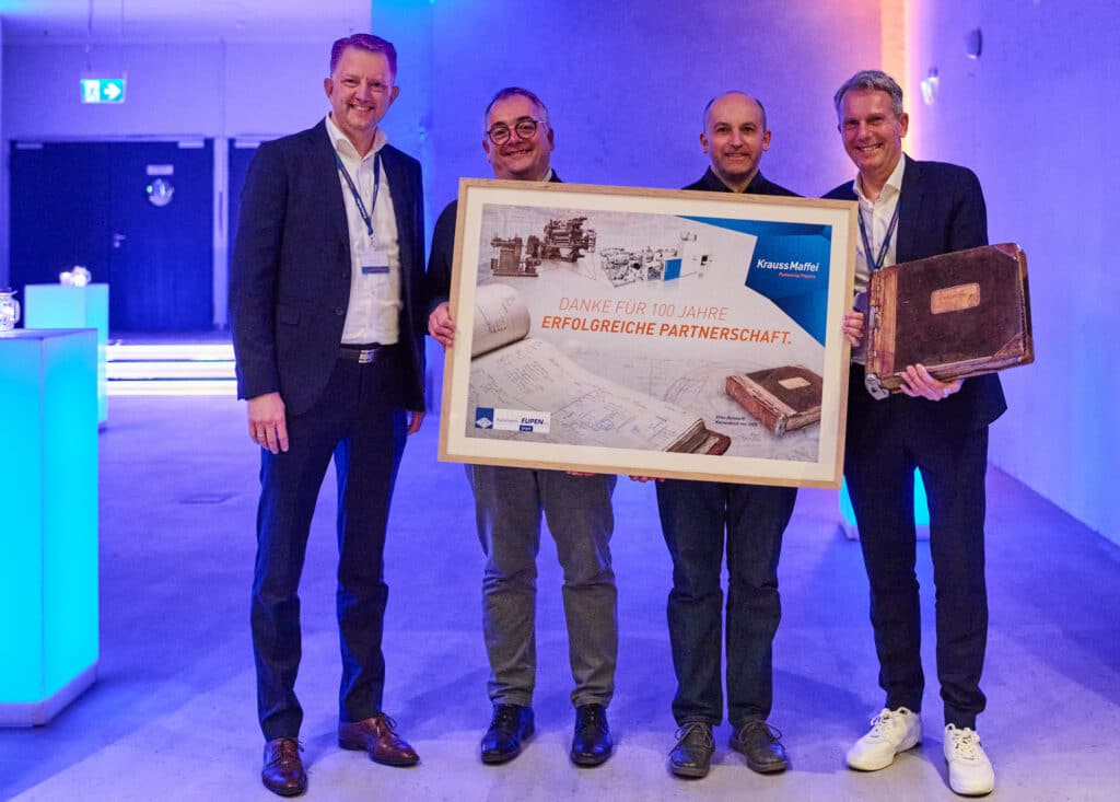 Ein besonderes Highlight anlässlich der Abendveranstaltung war die feierliche Übergabe eines aussergewöhnlichen Geschenks an den langjährigen Kunden Kabelwerk Eupen AG. Bei der Durchsicht der Firmenarchive hatten Mitarbeiter der KraussMaffei Extrusion ein mehr als 100 Jahre altes Debitorenbuch mit einer handschriftlichen Notiz von Kabelwerk Eupen entdeckt. Ralf Benack, Managing Director bei KraussMaffei Extrusion, und Klaus Lorius, Head of Sales Pipe & Profile, überreichten eine gedruckte Collage dieses historischen Dokuments an Michael Goebels, Plant Manager Pipe Division, und Patrick Ernst, Head of Department Production Pipe bei Kabelwerk Eupen.