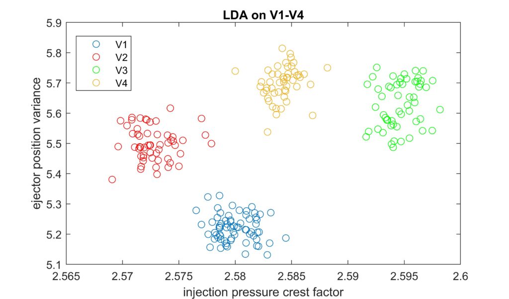 In einem ersten Schritt wurde analysiert, mit welchen und wie vielen Features sich die einzelnen Testreihen klassifizieren lassen. Um herauszufinden, welche Features hierbei den grössten Einfluss haben, wurde eine Forward Stepwise Selection ausgeführt. Als Resultat liefert dieses Verfahren eine geordnete Liste von geeigneten Features. Die Daten aus den Testserien V1-V4 können mit bloss zwei dieser Features vollständig getrennt werden. Ein Beispiel für Features, welche diese Trennung sehr gut ermöglichen, sind in Bild 2 dargestellt. Dabei wurde für die eigentliche Klassifizierung der Versuchsreihen eine Linear Discriminant Analysis (LDA) benutzt.