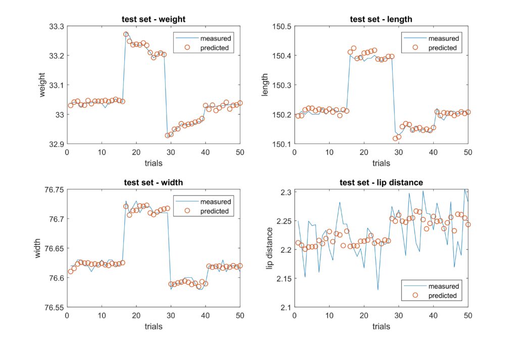 Die entwickelten Modelle wurden zudem weiter an Testserien (zufällige Daten aus den Versuchsreihen, welche nicht für die Entwicklung und das Training der Modelle verwendet wurden) getestet, in dem die Qualitätsmerkmale dieser Bauteile vorausgesagt werden konnten. Die Ergebnisse sind in Bild 3 dargestellt.