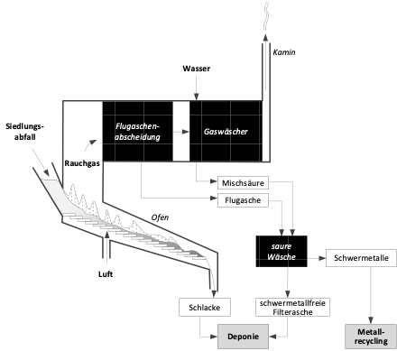In der Flugaschenabscheidung der Kehrichtverwertungsanlage fällt die schwermetallhaltige Flugasche an. Die sauren Bestandteile aus dem Rauchgas, hauptsächlich Salzsäure, werden im Gaswäscher als Mischsäure ausgewaschen und damit die Flugaschen sauer gewaschen. Die extrahierten Schwermetalle werden dem Recycling zugeführt und der gewaschene Rest zusammen mit der Schlacke deponiert.